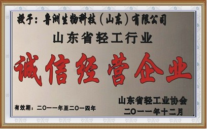 1月10日,山東省輕工業(yè)協(xié)會在濟南召開全省輕工業(yè)工作會議,對在“ 誠信山東”建設(shè)工作中做出貢獻的誠信經(jīng)營企業(yè)進行表彰,會上,魯洲生物科技(山東)有限公司被授予“山東省輕工行業(yè)誠信經(jīng)營企業(yè)”并頒發(fā)了獎牌。